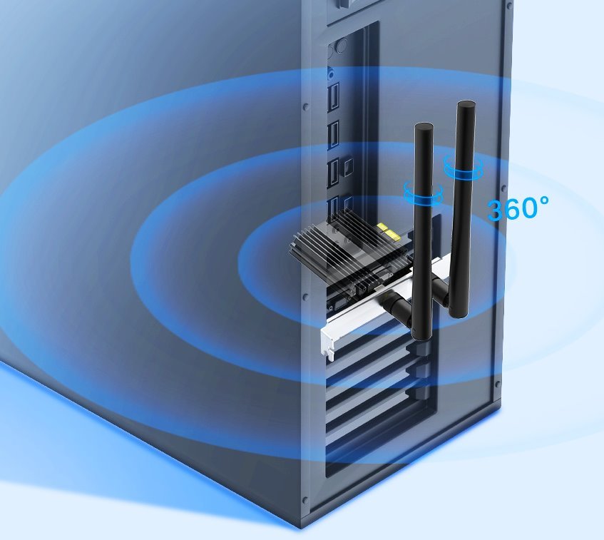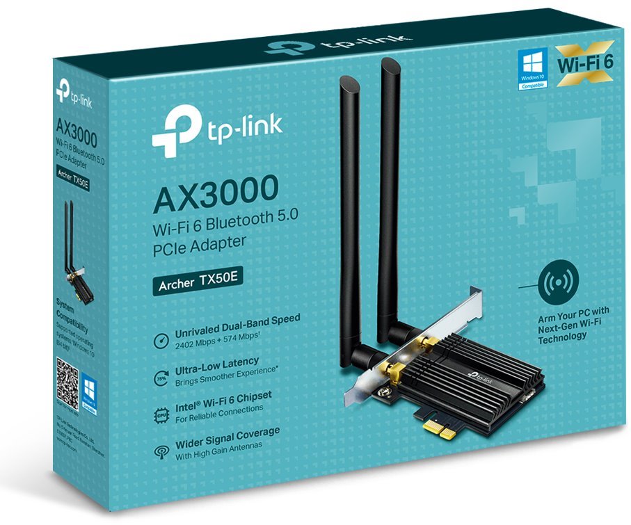 TP-Link Archer TX50E je bezdrátový adaptér do PCI-Express sběrnice, který nabídne bezproblémový chod WiFi6 technologie s modulační rychlostí 2402Mbps (5GHz) + 574Mbps (2.4GHz) a k tomu navíc Bluetooth 5.0, který poskytuje 2x vyšší rychlost a 4x širší pokrytí než předchozí generace Bluetooth 4.2. Adaptér má 2 odnímatelné antény, které se starají o široké pokrytí.