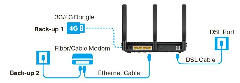 Archer VR2100 je navržen tak, aby vás kdykoliv připojil k internetu. Port Ethernet WAN podporuje kabelové připojení ke kabelovému nebo síťovému modemu. V případě, že selže vaše připojení k internetu, připojte 3G / 4G adaptér k portu USB 3.0, který bude sloužit jako záložní možnost.