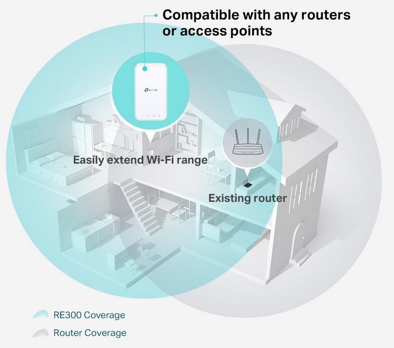 RE300 se bezdrátově připojuje k vašemu routeru, posiluje a rozšiřuje svůj signál do oblastí, kam sám nedosáhne. S rychlostí až 300 Mb/s v pásmu 2,4 GHz a 867 Mbps v pásmu 5 GHz.