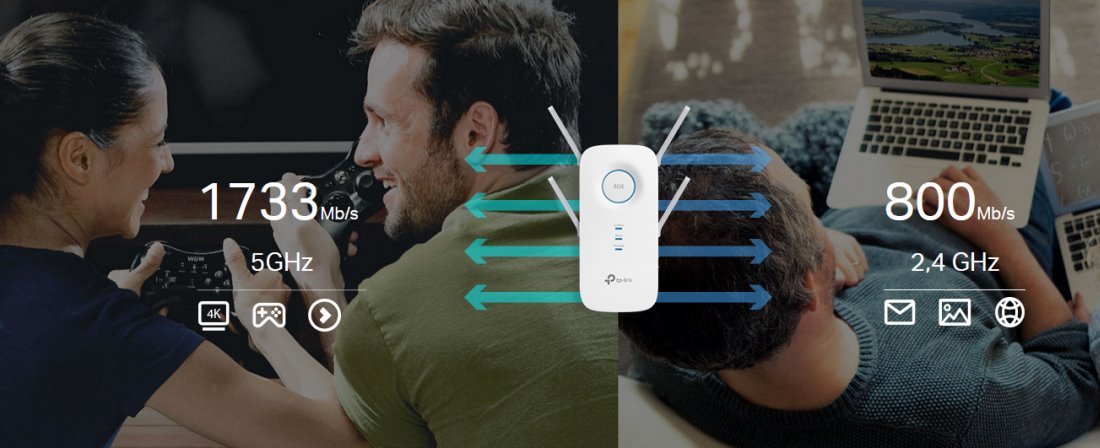 Díky využití technologie se 4 streamy pro zvýšení možností Wi-Fi sítě dosahuje extender RE650 nejvyšších rychlostí ve svém oboru, kdy nabízí maximální rychlost až 800 Mb/s v pásmu 2,4 GHz a 1733 Mb/s v pásmu 5 GHz. Je tak zaručena rychlost přenosu dat a špičkový výkon, jaký potřebujete, když chcete využívat internet těmi nejnáročnějšími způsoby, jako je souběžné streamování videí s rozlišením 4K a hraní her bez zadrhávání a zpoždění.