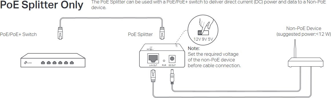 Splitter PoE TL-POE10R plně vyhovuje standardu IEEE 802.3af a podporuje všechny adaptéry PSE Supplier nebo PoE kompatibilní se standardem IEEE 802.3af PoE, např. TP-LINK TL-SF1008P nebo TL-POE150S, nebo jiné podobné produkty a dodává stejnosměrný proud 12 V, 9 V nebo 5 V tam, kde není elektrické vedení či zásuvka pro připojení zařízení, jako jsou přístupové body, IP kamery, IP telefony apod.