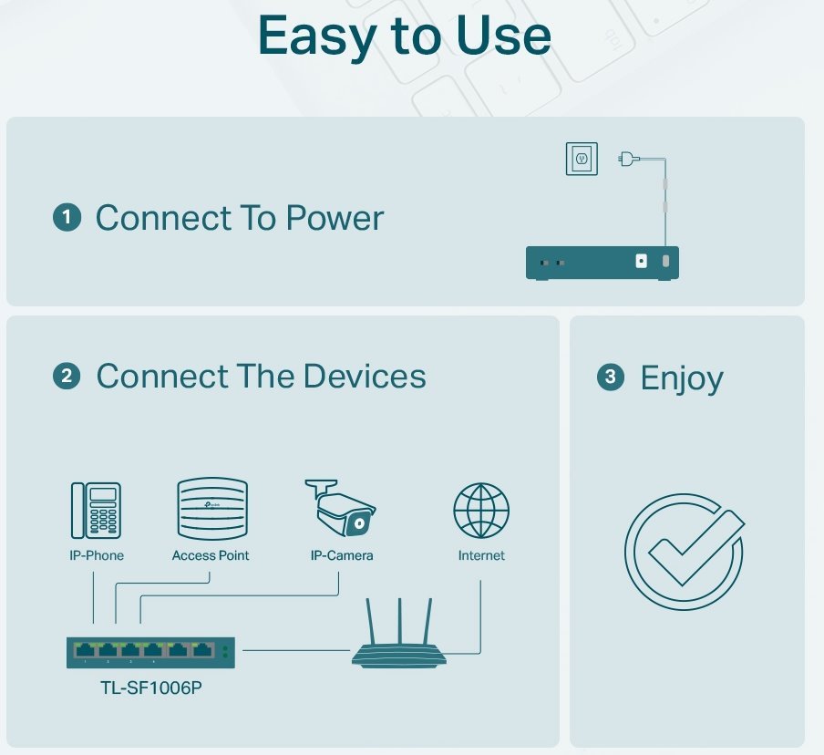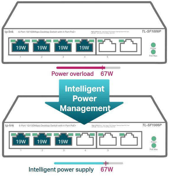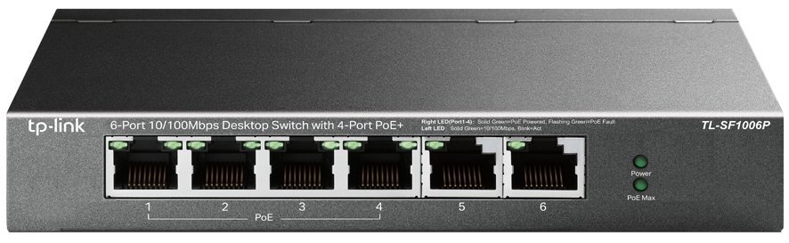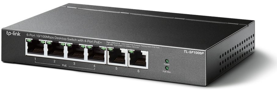TP-Link PoE Switch TL-SF1006P je nemanagovatelný PoE Switch s 6x 10/100Mbps z čehož pouze 4 porty podporují PoE-Out se standardem 802.3af/at (až 30W/port). Celkový PoE budget switche je 67W. Switch umožňuje i PoE na vzdálenost 250m při přepnutí speciálního přepínače, který způsobí ponížení linkové rychlosti na PoE portech na 10Mbps, což pro přenos obrazu z kamer bohatě stačí. Dalším bonusem switche jsou prioritní porty a inteligentní Power Management pro případné odpojení PoE zařízení v případě nedostatečného PoE budgetu.
