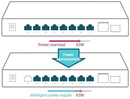 Pokud celkové zatížení switche přesáhne 63W, inteligentní správa napájení odpojí napájení na portu s nižší prioritou, aby byl zajištěn dostatek výkonu pro zařízení s vyšší prioritou a nedošlo k přetížení POE switche.