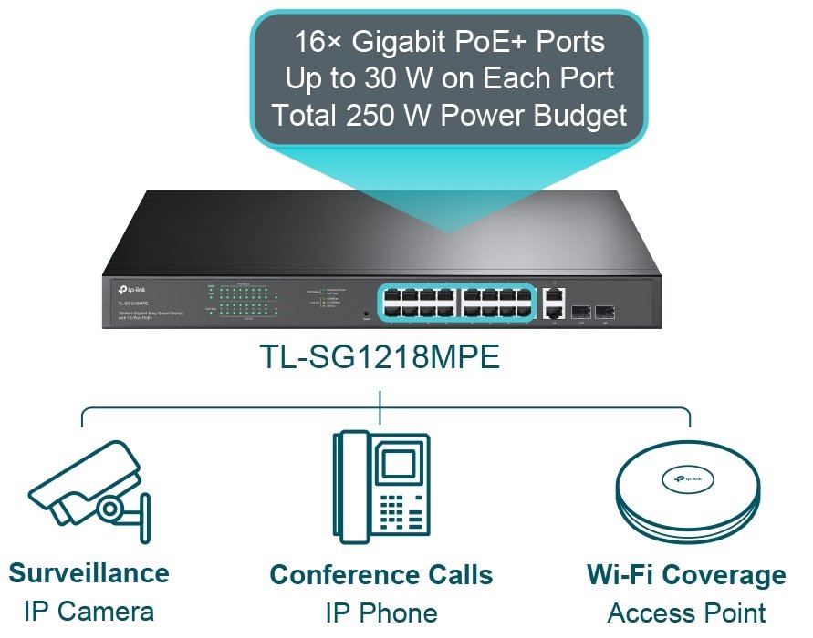 Gigabitový switch TL-SG1218MPE nabízí (16) 10/100/1000 Mbps portů, které podporují PoE ve standardech 802.3at/af (30W/port) s celkovým napájením o výkonu 192W. Je ideální pro zajištění provozu kamerových systémů v menších a středních firmách. Switch je dále vybaven (2) Gigabit SFP sloty, jež rozšiřují flexibilitu sítě. Nabízí rovněž variabilní řízení síťového provozu QoS ve čtyřech frontách na bázi 802,1p/DSCP, užitečné strategie zabezpečení, včetně fyzického zámku a bohaté funkce správy na 2. vrstvě. Samozřejmostí je management (Web; Easy Smart Configuration Utility) , IPv6 support a VLAN. Funkce IGMP snooping navíc optimalizuje přenos multimedií speciálně pro IPTV.