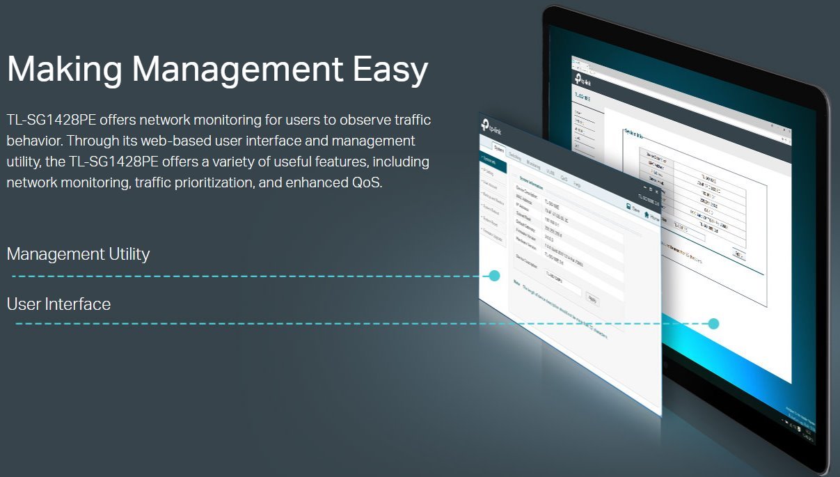 TL-SG1428PE nabízí uživatelům monitorování sítě za účelem sledování chování provozu. Prostřednictvím webového rozhraní nebo aplikace nabízí TL-SG1428PE řadu užitečných funkcí, včetně monitorování sítě, prioritizace provozu a vylepšeného QoS.