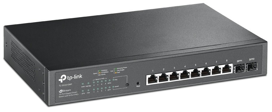 Jetstream TL-SG2210MP PoE Switch značky TP-Link je managovatelný L2 switch s funkcí PoE, obsahující 8 Gigabitových LAN portů s funkcí 802.3af/at PoE a k tomu další 2 Gigabitové SFP porty. Switch má celkový PoE budget pro napájení zařízení po kabelu 150W, switch lze pohodlně montovat do 19" racku pomocí rackových uší, které jsou součástí balení. O dostatečné chlazení se stará 1 venlitároy z boku.