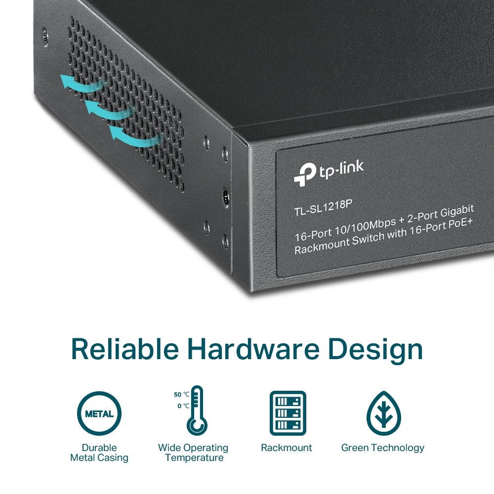 TP-LINK • TL-SL1218P • 16-Port 10/100Mbps + 2-Port Gigabit Rackmount Switch with 16-Port PoE+