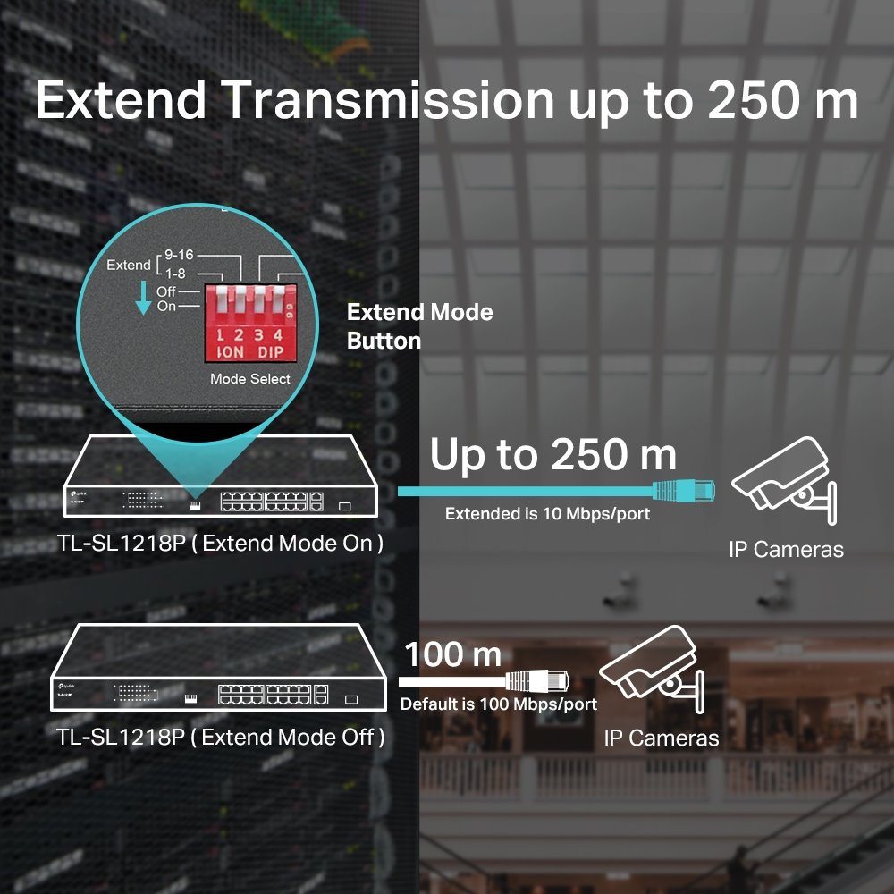 TL-SL1218P je nemanagovatelný rackmount PoE switch s 18ti porty a jedním combo SFP. Prvních 16 portů mají rychlost 10/100Mbps a podporují 802.3af/at PoE s maximální spotřebou 30W/port a celkovým PoE budgetem 150W. Další 2 porty jsou gigabitové, sloužící jako uplink do sítě z čehož poslední port je jako combo port s gigabitovým SFP portem. Switch má na portech 1-16 možnost přepnutí na Extended Mode, což pomůže například při instalaci kamer, kdy dosah ze 100m je rozšířen až na 250m. Při této funkci je link ponížen na 10Mbps.