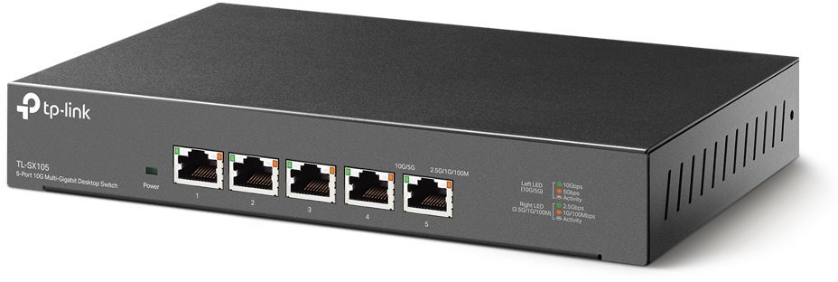 Firma TP-Link přichází s novou řadou 10-Gigabitových switchů, které dokážou navázat až 10Gbps link na každém portu. Tento model TL-SX105 bez managementu v kovovém šasi má celkově 5 metalických portů, které dokáží navázat link s rychlostí 100M / 1G / 2.5G / 5G / 10Gbps, indikační LED na každém portu a jeden DC konektor pro napájení switche na zadní straně.