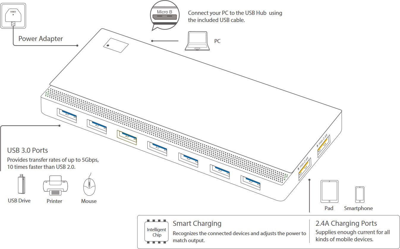 USB rozbočovač UH720 je skvělou volbou pro rozšíření USB portů počítače pro přenos dat, když potřebujete současně připojit USB disk, USB myš, tiskárnu nebo jiná zařízení. Port USB 3.0 umožňuje přenosovou rychlost až 5 Gbit/s, 10 rychlejší než USB 2.0 Díky dvěma 5V 2,4A nabíjecím portům je rozbočovač schopen uspokojit požadavky všech vašich mobilních zařízení.