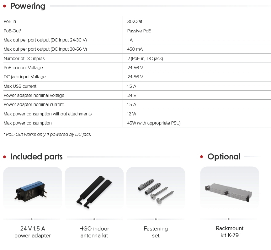 Zařízení osazeno gigabitovými ethernetovými porty. Port 1 podporuje "PoE-In" napájení.