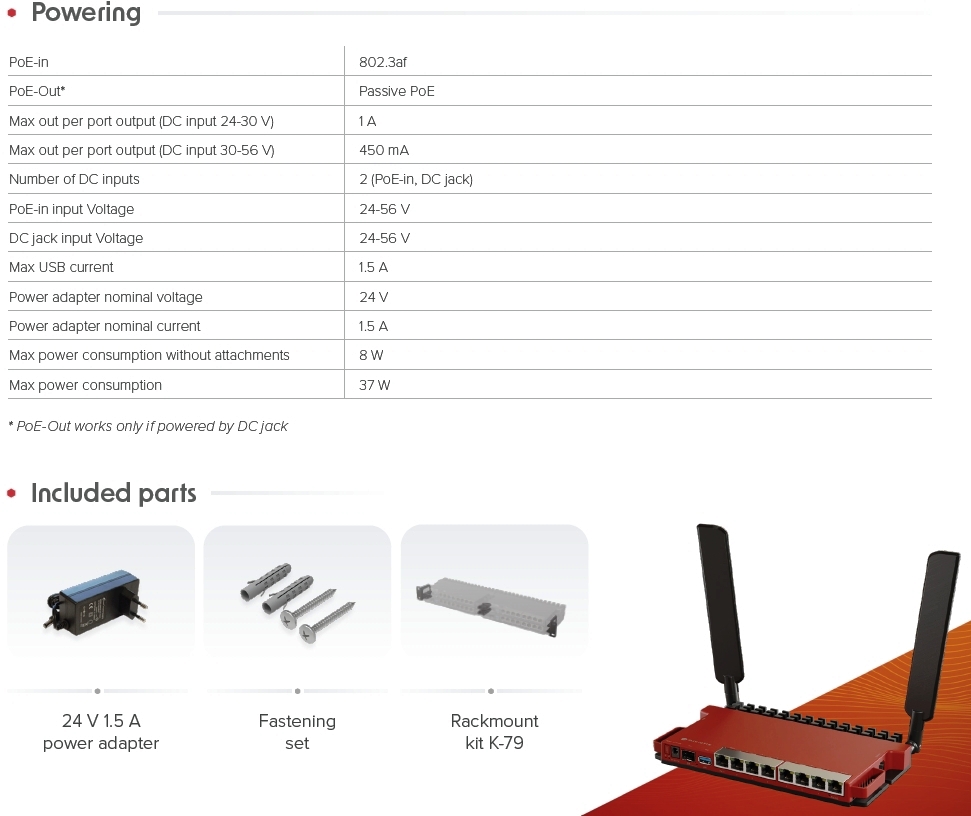 Zařízení je osazeno gigabitovými ethernetovými porty. Port 1 podporuje "PoE-In" napájení.