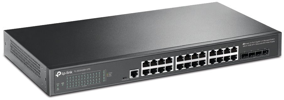 TL-SG3428X-UPS poskytuje 24x 10/100/1000 Mbps LAN portů. Navíc jsou k dispozici i 4x 10G SFP+ sloty. Ke správě a monitoringu je možné využít běžný přístup přes webové rozhraní a protokoly např. CLI, SNMP, RMO, ale i centralizovaný cloud management a softw