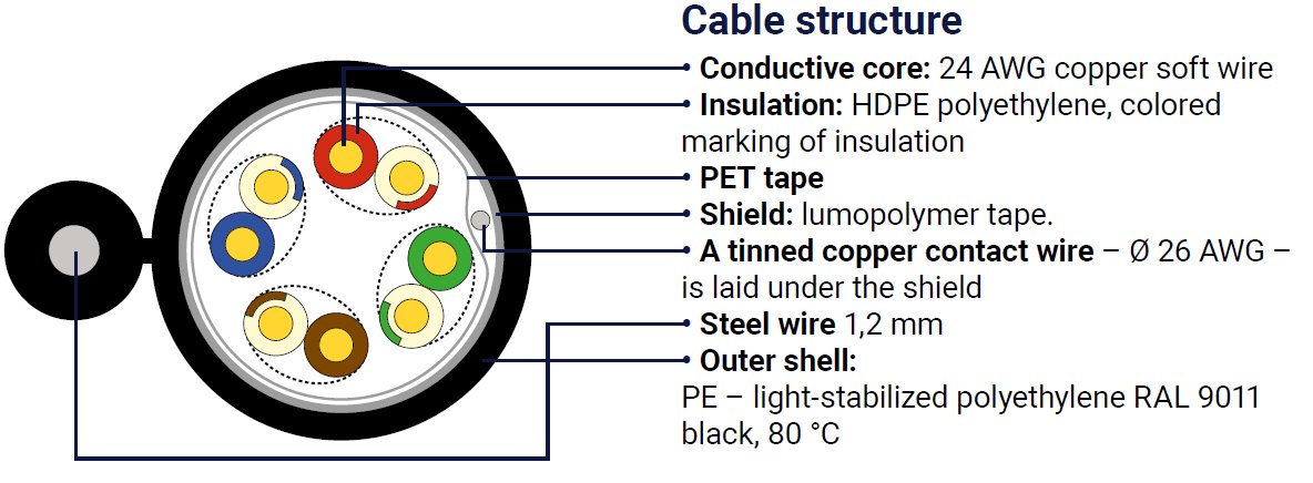 Kvalitní síťové stíněné samonosné kabely pro venkovní použití DATAWAY podporující protokoly 1000Base-Tkategorie CAT5E, s podporou šířky pásma až 100 MHz.