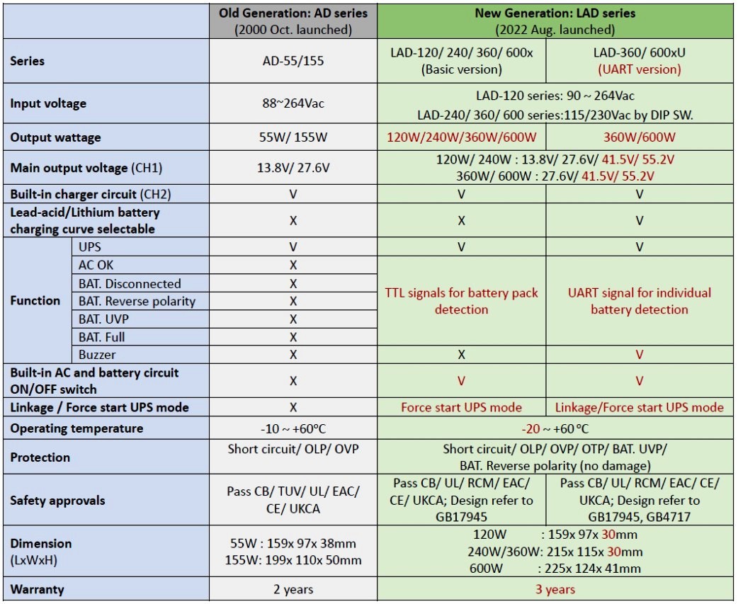 Inovovaná řada LAD-240 nahrazující předcházející modelovou řadu AD-155 jsou 240W úsporné průmyslové zdroje AC/DC s nízkým profilem a funkcí UPS