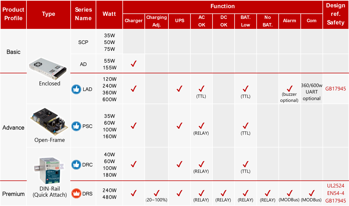 Inovovaná řada LAD-240 nahrazující předcházející modelovou řadu AD-155 jsou 240W úsporné průmyslové zdroje AC/DC s nízkým profilem a funkcí UPS
