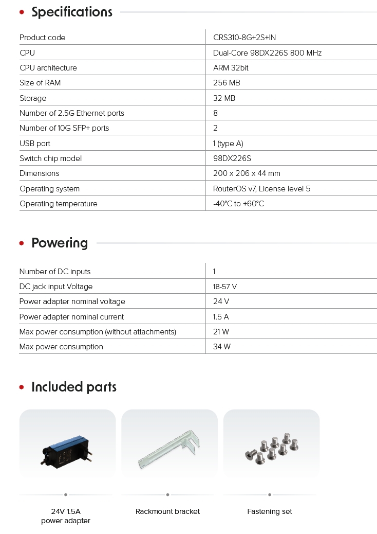 Model CRS310-8G+2S+IN vám nabízí řešení integrující kombinaci osmi 2,5 Gbps ethernet portů a dvou 10Bgps portů SFP+ v kompaktním a výkonném prvku.