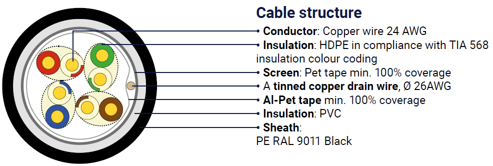 Kvalitní síťové stíněné dvouplášťové kabely pro venkovní použití DATAWAY podporující protokoly 1000Base-Tkategorie CAT5E, s podporou šířky pásma až 100 MHz.