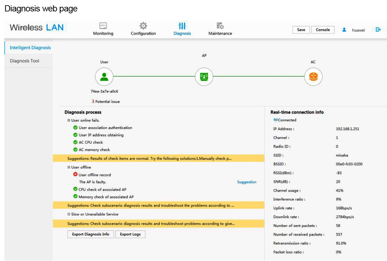 Webový systém podporuje inteligentní diagnostiku v reálném čase a periodickou diagnostiku jedním kliknutím z rozměrů uživatelů, přístupových bodů a zařízení WAC a poskytuje proveditelné návrhy na řešení problémů.