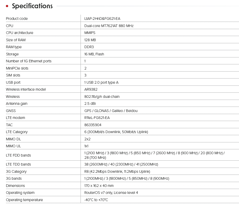 LTE Category: 6 (300Mbit/s Downlink, 50Mbit/s Uplink)