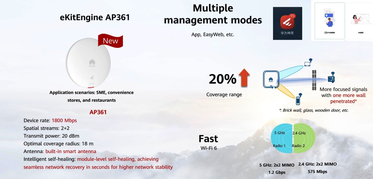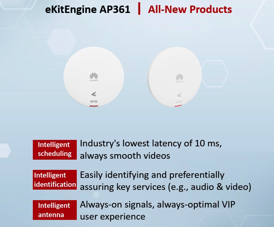 Huawei eKitEngine AP361 je vnitřní přístupový bod (AP) standardu Wi-Fi 6 (802.11ax). Poskytuje služby současně ve frekvenčních pásmech 2,4 GHz (2x2 MIMO) a 5 GHz (2x2 MIMO) a dosahuje maximální rychlosti zařízení 1,775 Gb/s. Toto AP se vyznačuje velkou šířkou pásma, vysokou souběžností a kompaktními rozměry, což usnadňuje flexibilní nasazení a šetří investice zákazníků. Takové přednosti předurčují tento přístupový bod k použití ve vnitřních scénářích pokrytí, jako jsou pracoviště malých podniků, malých a středně velkých nemocnic, komerčních nemovitostí, řetězce hotelů a základní a střední školy.