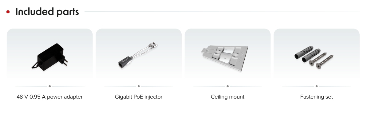 Konvertor se dodává se s injektorem PoE, napájecím zdrojem a instalačním příslušenstvím pro montáž na strop.