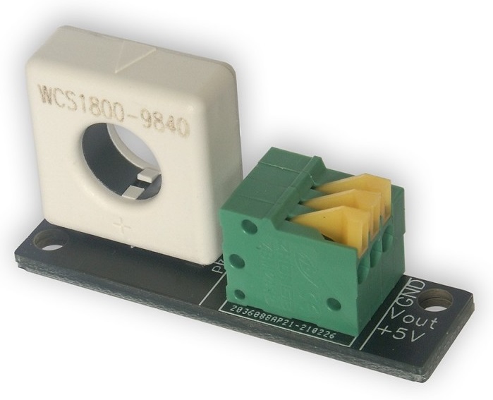 Hallův proudový senzor který měří proud v drátě přes otvor senzoru. Nevyžaduje přerušení kabelu a instalaci svorek.