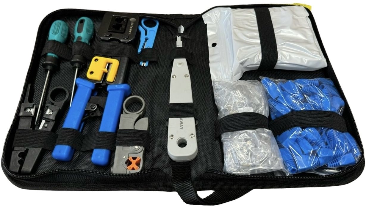 Sada nářadí obsahující kromě kvalitních krimpovacích kleští DATAWAY, které jsou určeny pro krimpování RJ45 EASY konektorů DATAWAY, také tester RJ45 kabelů, ořezávače kabelů, KRONE/110 nástroj a mnoho dalšího.