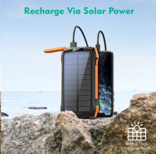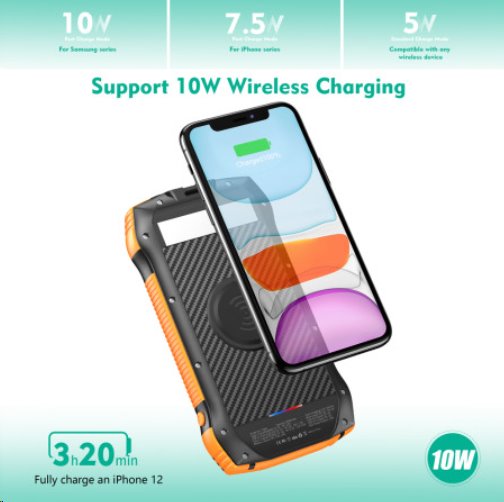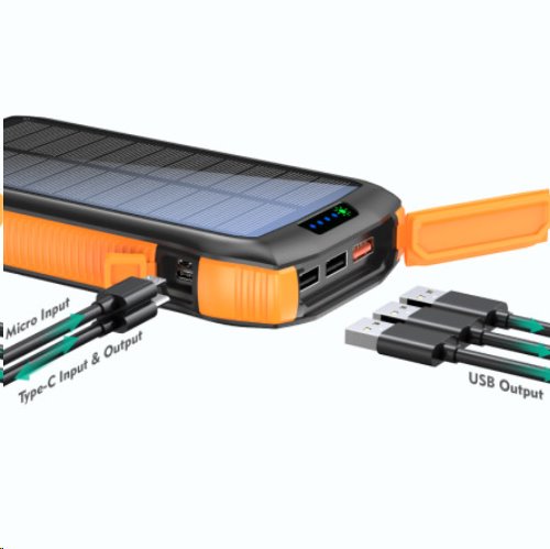 Outdoor solární powerbanka s kapacitou 20000 mAh (nabije až 10 zařízení), vodě a prachu odolná dle IP67, solární panel pro záložní dobíjení, bezdrátové nabíjení telefonů 10W, podpora quick charge 3.0 pro rychlé dobíjení PD 18W , Super Fast USB-C nabíjení Power Delivery PD 20W, simultální nabíjení a vybíjení až 4-mi konektory USB a C + bezdrátové nabíjení = až 5 zařízení možno nabíjet najednou, silná a jasná LED svítilna s mnoha funkcemi, závěsný popruh na trecking.