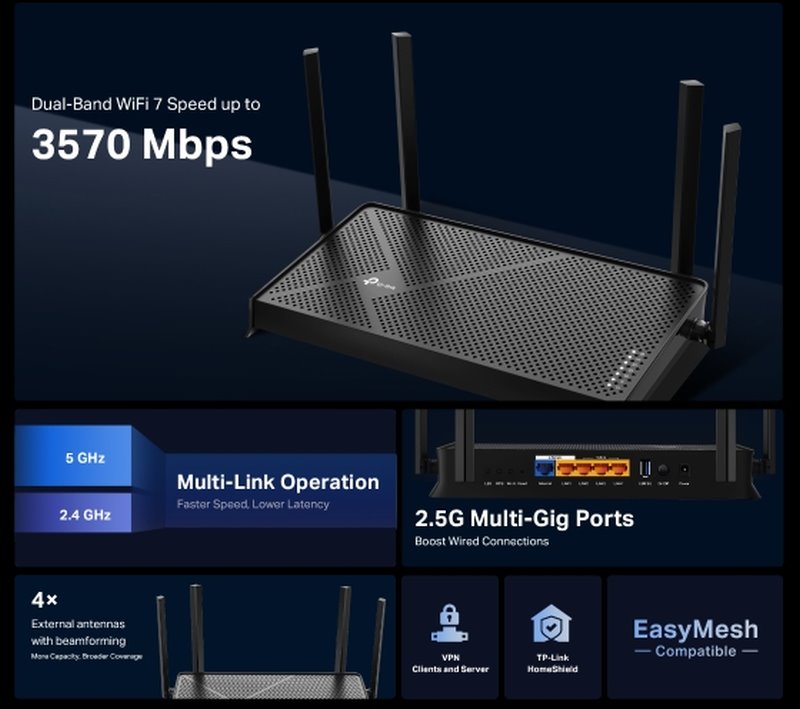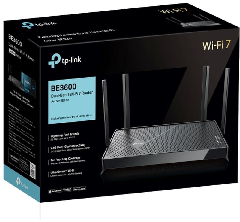 TP-Link Archer BE230 je nový dual-band Wi-Fi 7 router. Pro připojení do sítě je určen WAN port o rychlosti až 2,5 Gb/s. Pro ostatní zařízení je zde 1 LAN port o rychlosti 2,5 Gb/s a 3 LAN porty o rychlosti 1 Gb/s . V pásmu 5 GHz dosahuje rychlosti až 2880 Mb/s, v 2,4 GHz 688 Mb/s. Velkou výhodou je kompatibilita s meshovým systémem EasyMesh a OneMesh. Nastavení lze provést přes klasické webové rozhraní nebo v mobilní aplikaci Tether App. Pro bezpečnější připojení k internetu lze využít VPN.