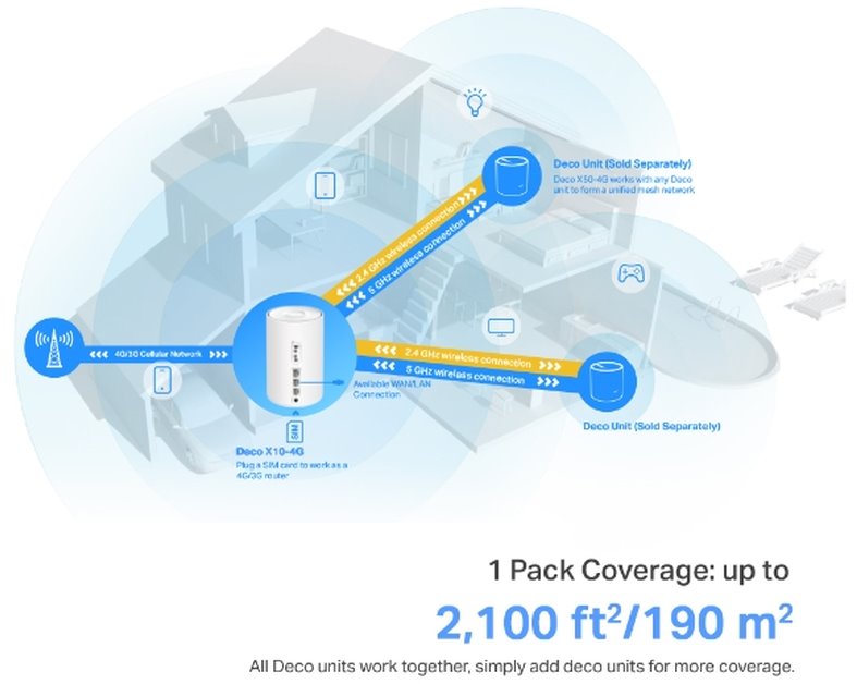 Vyzbrojen zabudovaným 4G+ modemem, WiFi 6 a TP-Link Mesh technologií je Deco X10-4G vhodné pro 4G internetové sdílení a vynikající WiFi síť pro celý dům . Vložte vaši SIM kartu a vychutnejte si 4G rychlost!