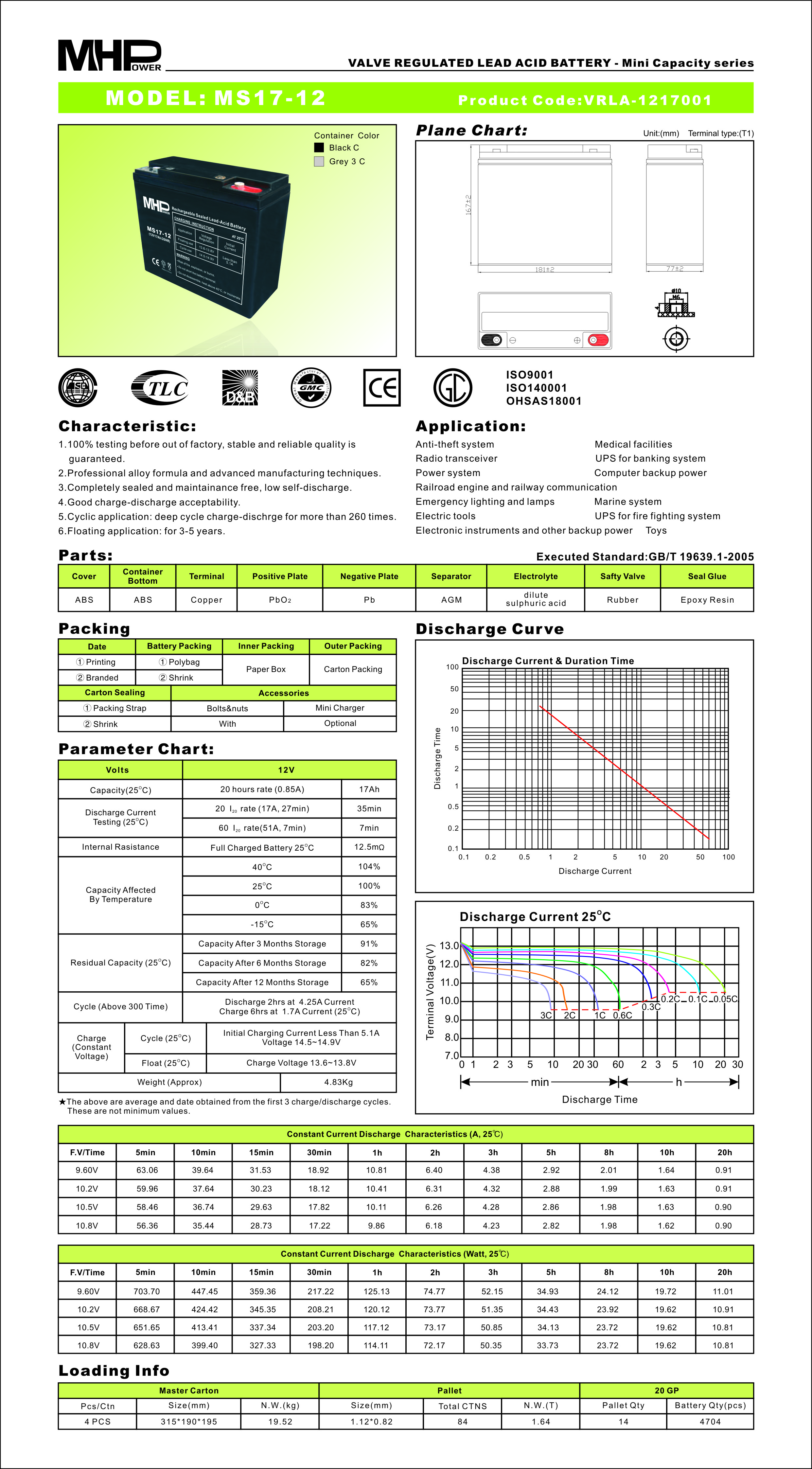 MHPower battery • MS17-12 • MHPower olověný akumulátor AGM 12V/17Ah, Terminál T1 - M6