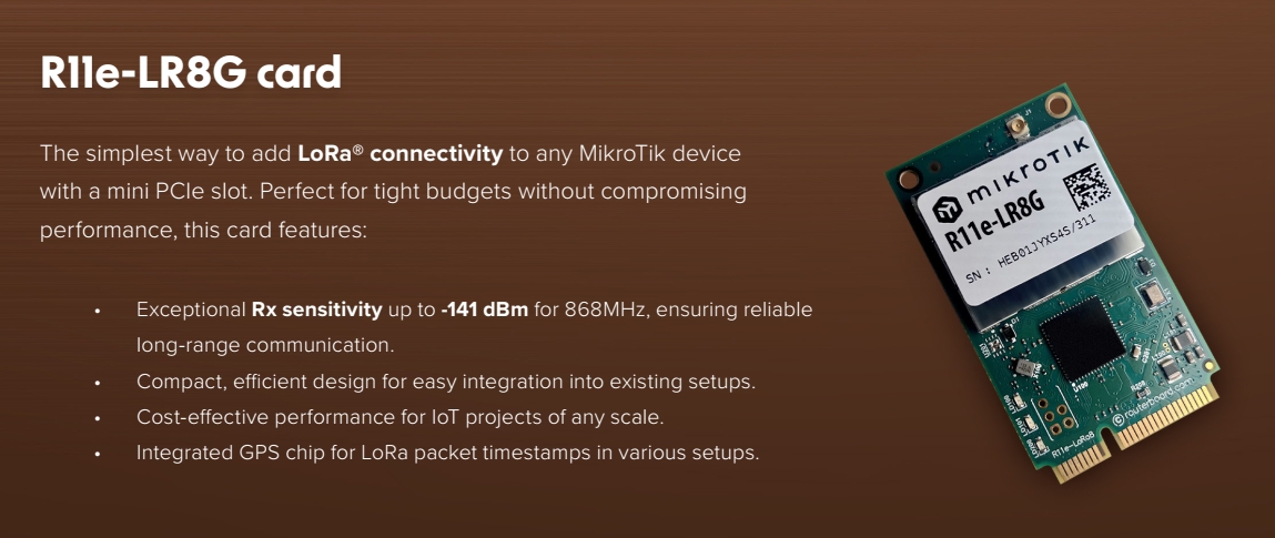 Karta R11e-LoRa8G je nejjednodušší způsob, jak přidat konektivitu LoRa® do jakéhokoli zařízení MikroTik se slotem mini PCIe.