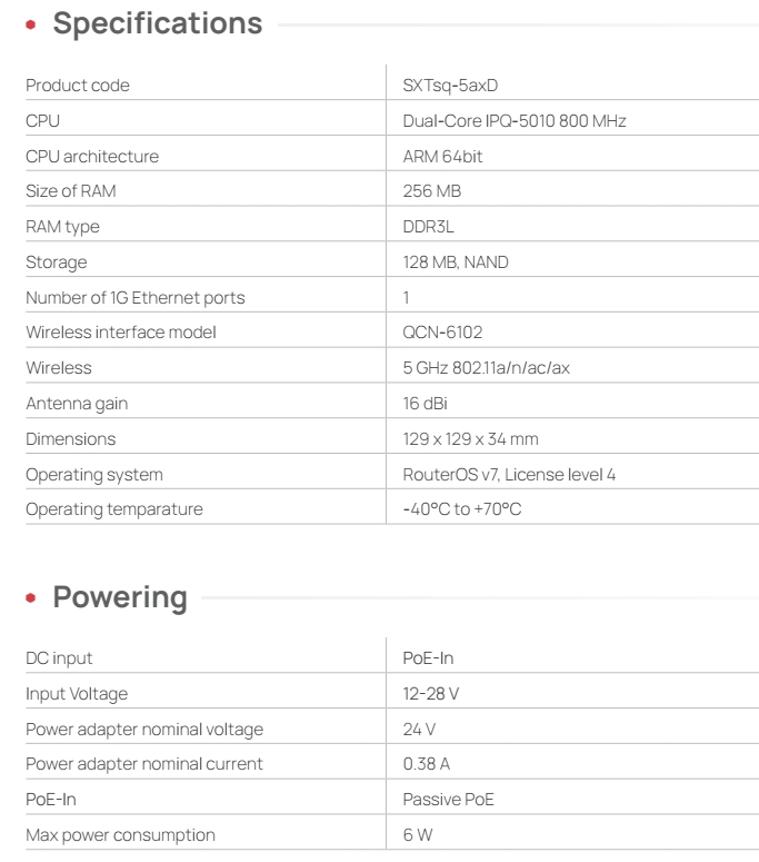 Jednotka osazena Qualcomm QCN-6102 Wi-Fi 6 (802.11ax) radiovým modulem, předinstalovaná RouterOS licence L4 (AP/Bridge/Klient).
