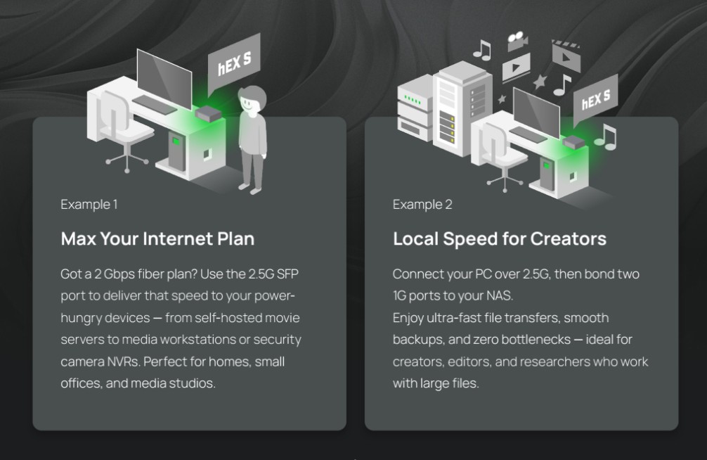 hEX S je kompaktní router osazen 5× gigabitovými porty Ethernet (včetně PoE-in na portu 1 a PoE-out na portu 5) a 2,5gigabitovou SFP šachtou.