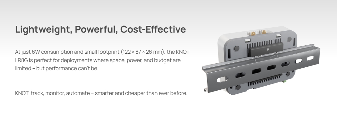 Díky spotřebě pouhých 6 W a malým rozměrům (122 × 87 × 26 mm) je zařízení KNOT LR8G ideální pro nasazení tam, kde je omezený prostor, energie i rozpočet, ale ne výkon.