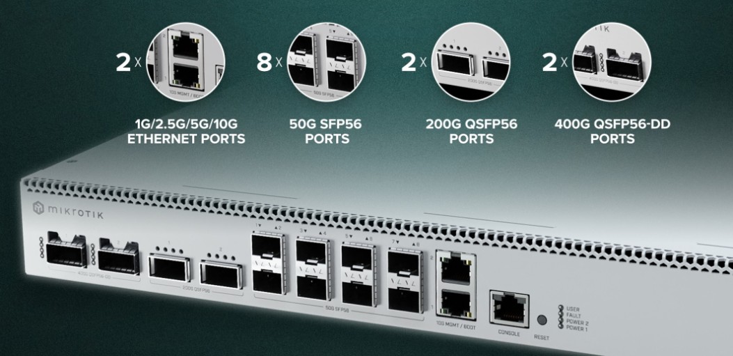 MIKROTIK • CRS812-8DS-2DQ-2DDQ-RM • 2x 400G QSFP-DD, 2x 200G QSFP56, 8x 50G SFP56, 2x 10GE CRS812 DDQ