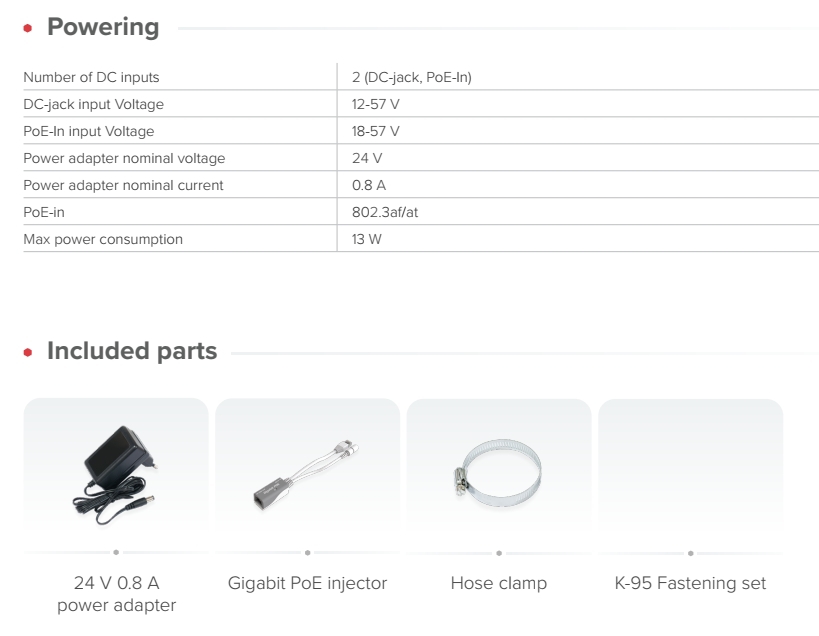 Zařízení je vybaveno dvěma gigabitovými ethernetovými porty, z nichž jeden má PoE-in pro flexibilní možnosti napájení.
